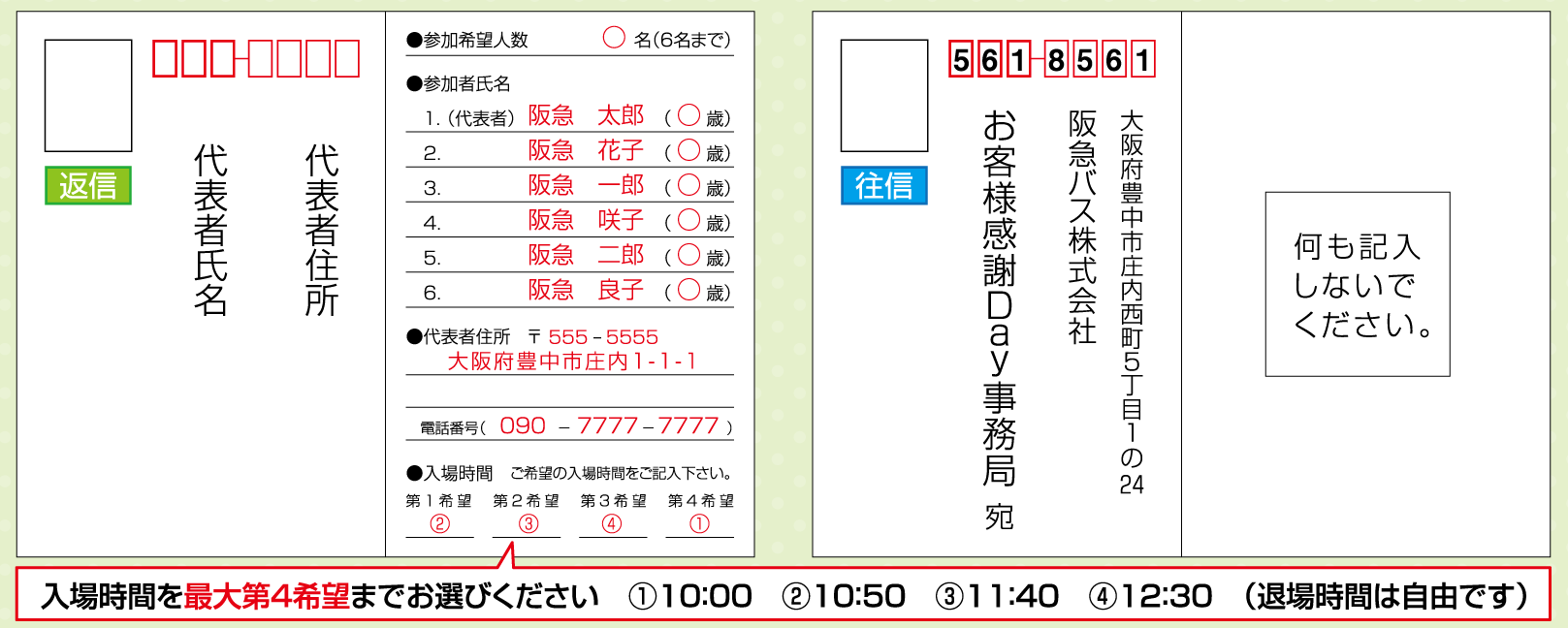 往復ハガキをご用意のうえ、下記の記入例を参考に必要事項をご記入いただきご応募ください。
