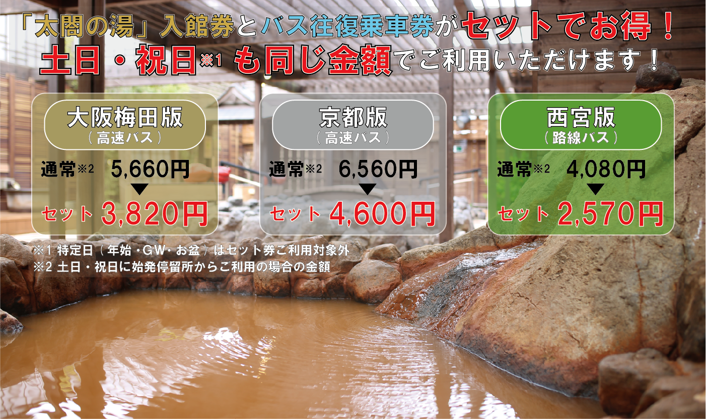 発売内容:高速バス「有馬温泉~大阪線」往復乗車券 + 「有馬温泉 太閤の湯」入館券