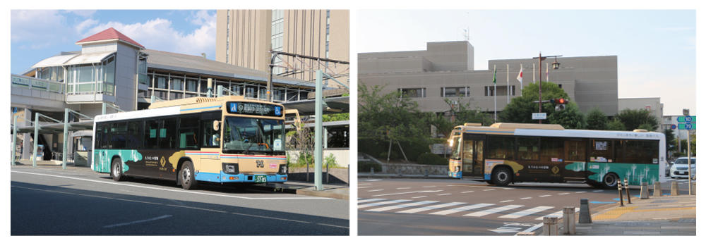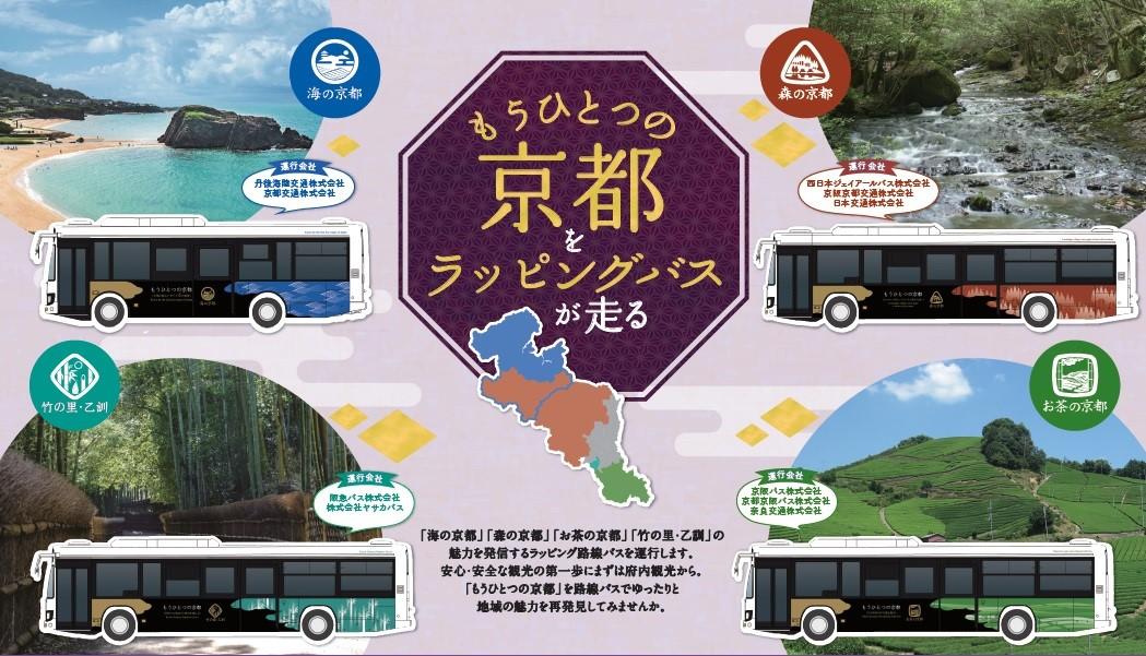京都府では、新型コロナウイルス感染症の影響を受け、ご利用されるお客様が減少している府内の公共交通の活性化を図り、観光の需要を喚起するため、『もうひとつの京都』の4エリア(海の京都、森の京都、お茶の京都、竹の里・乙訓)で路線バスを運行している事業者10社各1両ずつ、計10両に各エリアをイメージするラッピングバスを運行しています。