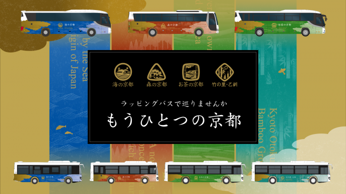 京都府では、新型コロナウイルス感染症の影響を受けご利用されるお客様が減少している府内の公共交通の活性化を図り、観光の需要を喚起するため、『もうひとつの京都』の4エリア(海の京都、森の京都、お茶の京都、竹の里・乙訓)で路線バスを運行している事業者10社各2両ずつ、計20両に各エリアをイメージするラッピングバスを運行しています。