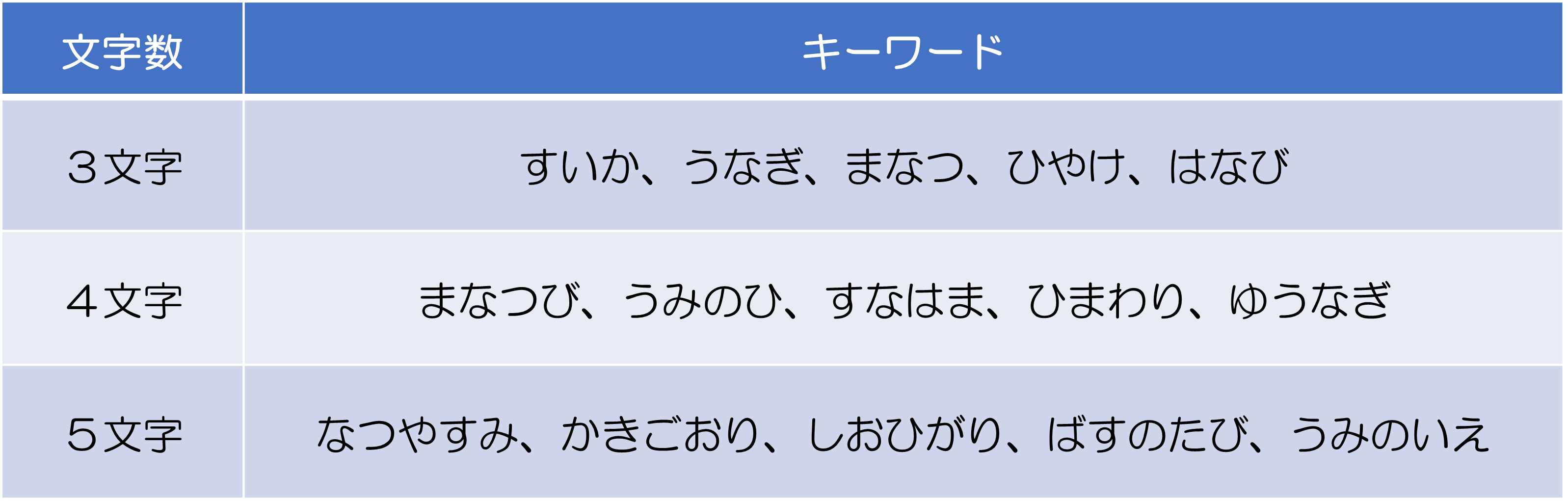 以下のとおり3文字~5文字の夏にちなんだキーワードを設定します。