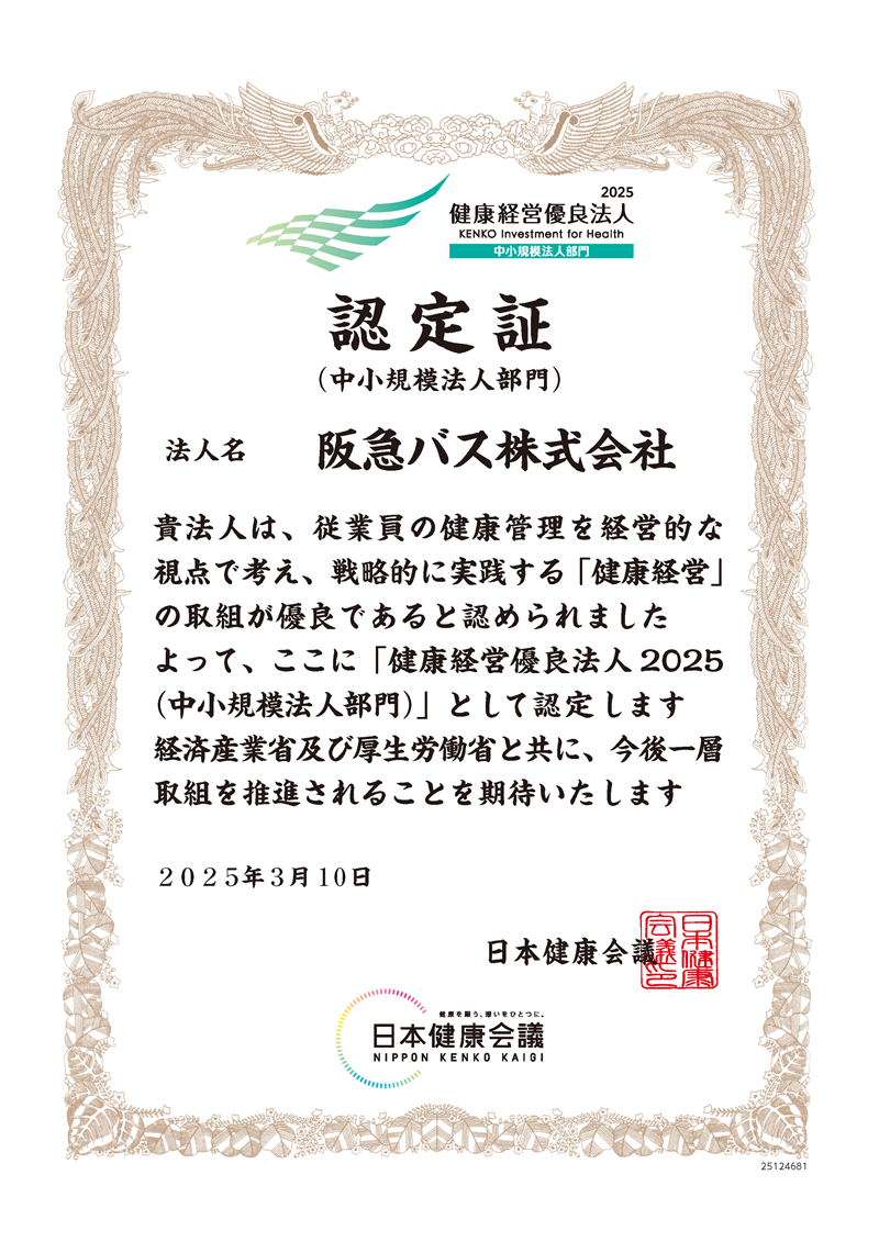 阪急バスでは従業員やその家族の心身の「健康」が幸せの原点であり、これを実現するため、従業員一人ひとりが自らの健康に高い意識を持ち、職場の仲間や家族とともに健康づくりに取り組むべく、会社を挙げて『健康経営』を推し進めています。