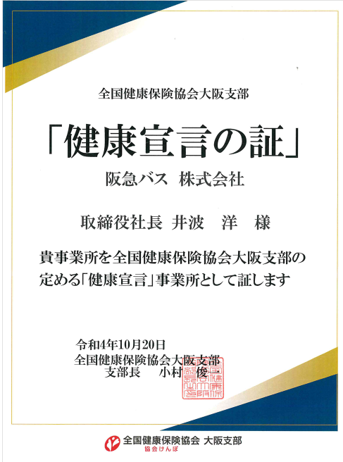 【全国健康保険協会大阪支部による「健康宣言の証」】