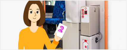 (Numbered tickets are not issued for the first stop, so passengers can board the bus without a ticket. Buses that run city routes with a flat rate may not have a numbered ticket machine, or if there is one it may be covered. If so, passengers can board the bus without a ticket.)
