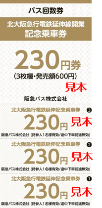 北大阪急行電鉄延伸線の開業を記念して、「阪急バスの回数券(230円券×3枚綴り)」と「北大阪急行電鉄の1日乗車券」をセットにした、お得な「北大阪急行電鉄延伸線開業記念乗車券セット」が箕面市民の方を対象に発売されます。
