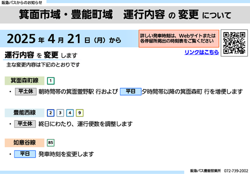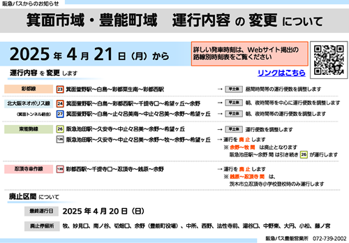 日頃より阪急バスをご利用いただきまして、誠にありがとうございます。 4月21日(水)より、箕面市域・豊能町域の運行内容が変更になります。詳細は下記の お知らせをご確認ください。※4月7日に新時刻表を掲載しました。各停留所ページよりご確認ください。