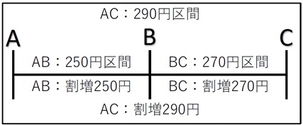 1 250円(AB割増運賃)+270円(BC通常運賃)+270円(BC割増運賃)=790円(乗り越し運賃)